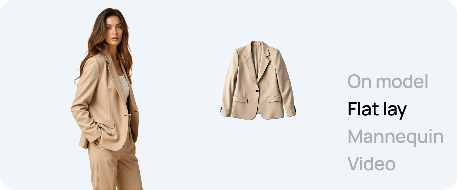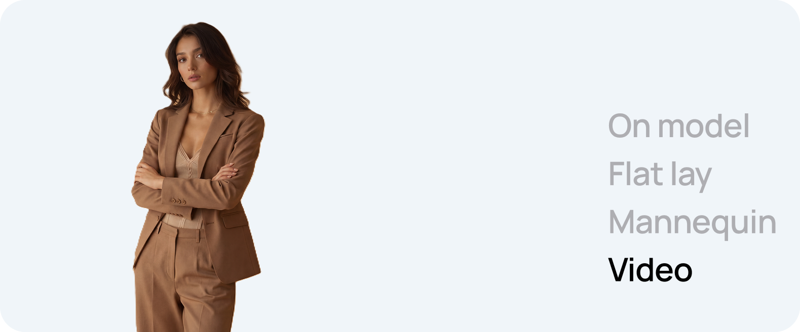 Загрузите фотографию одежды и получите готовый образ на профессиональной AI-модели. Выбирайте позу, фон и стиль съёмки.